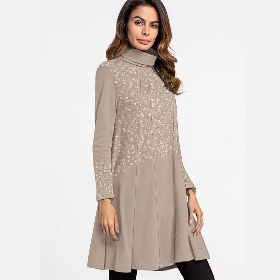 Ladies High Neck Long Sleeve Dress Beige Floral