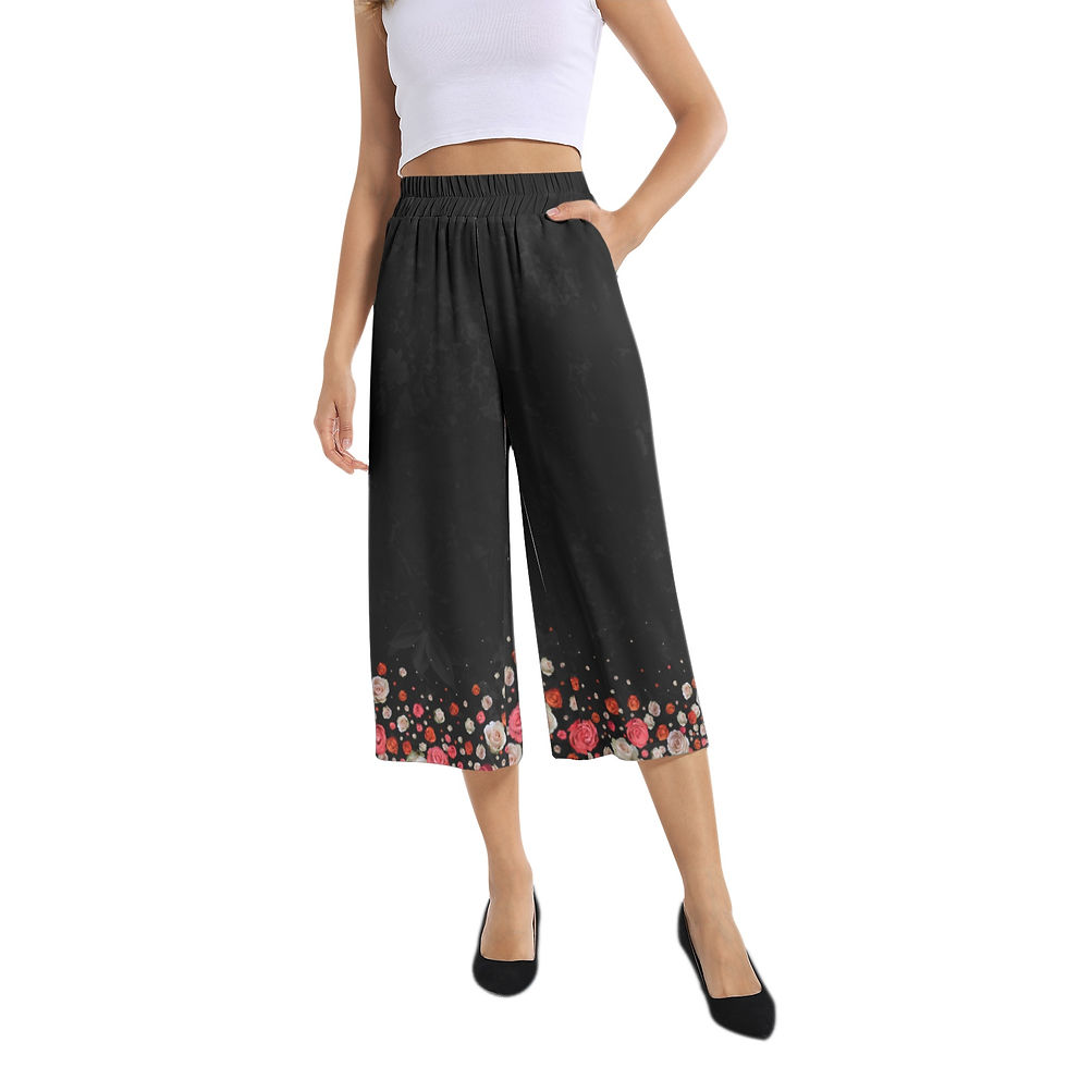 Elastic Waist Capris Wide Leg Pant Roses Print on Black